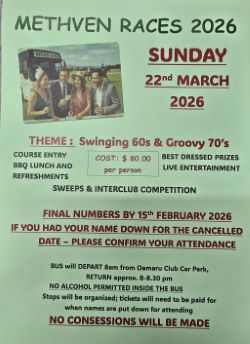 METHVEN RACES: as time ticks by all tickets must be paid for by Friday 9th (this week) by 4pm to secure your seat, $ 80.00 per person - 1st in best seat, great day out with lots of laughs, great food, drink and entertainment, so get in quick for a fantastic trip.